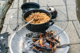 Confit de canard aus der Dose mit gefriergetrockneten Paprika, Erbsen, Bohnen und roter Johannisbeere.
