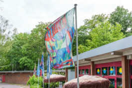 Für die Fahnen vor dem TROPEZ haben Grit Burmeister und Franzi Kleinert ihre Perspektive auf das Sommerbad abgebildet. Schwimmbad heißt Liebe, sagte Grit Burmeister, als sie von dem TROPEZ-Vorhaben hörte. Sie setzte ihre unverwechselbaren Menschenbilder mit Ölkreide auf die flächendeckenden Buntstift-Gewebe von Franzi Kleinert. Wesen wie aus einer anderen Welt schauen uns mit großen Augen an und die Münder weit aufgerissen zeigen sie die Zähne. Die Zähne zu zeigen heißt für Burmeister, sich zu wehren, gegen Ausgrenzung und Unverständnis. Mit Farbfeldern und Buchstaben verweisen Kleinerts Zeichnungen auf den Sommer.