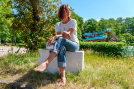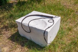 Weiß glänzend hebt sich der Marmorstein mit Po-Abdruck von der kleinen Rasenfläche neben der Terrasse ab. The Sacred Rock of Tropez zeigt den Jeansabdruck einer Fantasiegestalt mit Teufelsschwanz. Petrosomatoglyphen, vermeintliche Abdrücke von Prophet:innen, Gött:innen und Fabelwesen, gelten als heiliger Beweis ihrer Existenz. Sie finden Erwähnung in den unterschiedlichsten Etappen der Menschheitsgeschichte und wurden in verschiedenen Glaubensrichtungen verehrt. Maria Loboda überträgt die Vorstellung auf die Gegenwart und den Schwimmbadalltag: Könnte der Jeansabdruck auf dem weißen Marmor die Existenz eines überirdischen Wesens andeuten, das über den Schwimmbadalltag wacht? Loboda lädt die Besucher:innen ein, selbst Platz zu nehmen auf dem Stein – und für einen Moment in die Rolle des mysteriösen Wesens zu schlüpfen.