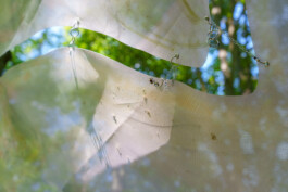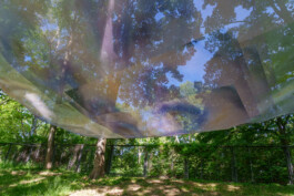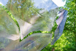 Krys Hubas Malerei S~e~e~d ist zwischen den Bäumen im hinteren Teil der Grünfläche des Schwimmbads installiert. Die halbtransparente Oberfläche zeigt Elemente wie Wasser, einen Schmetterling und Augen, die in die umliegende Vegetation schauen. Beim Betrachten des Werkes vermischt sich die Malerei mit den dahinterliegenden Blättern der Bäume. Die Projektionen der Sonne und die Bewegungen des Windes lassen das Kunstwerk fast wie eine (digitale) Leinwand wirken, deren Motive sich abhängig von der Natur stetig verändern. Der Schmetterling symbolisiert in verschiedenen Glaubenssystemen die Seele und Metamorphose. Er steht für vielfältige Transformationsprozesse sowohl in der Natur als auch innerhalb queerer Identitäten. S~e~e~d lädt ein, unter seinem Schutz zu verweilen und dem sanften Spiel von Sonnenlicht und Schatten zuzuschauen, das sich auf seiner Oberfläche entfaltet.