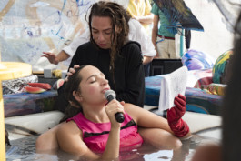 Rosa Rendl’s work is rooted not only in fine arts, but also in music and fashion—all of which come together in her working process. For her concert at TROPEZ, Rendl presents songs of her not yet released solo album Opportunity Lover, staged surrounded by photo prints on textiles. Furthermore, she presents selected pieces of her swimwear label RENDL.