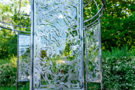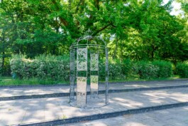 At the sun terrace behind the swimming pool, visitors discover Jimmy Beauquesne's installation Undawn (Domain of Stasis). The metal pavilion is decorated with distorted gothic patterns: they show intertwined hands whose fingers form hearts in eight different ways. The gestures capture a moment in time and preserve it forever, reminiscent of posing for a photograph or video. The metal structure demarcates a quiet area in the busy open air pool, questionning stereotypical poses and standardised symbols. The chapel-like shape invites visitors inside the sculpture to pause for a moment – to pose for a selfie or share an intimate moment.