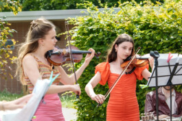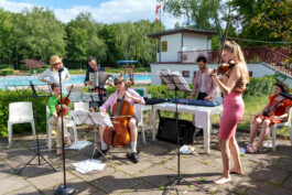 Für die Orchester-Performance bilden die Musiker:innen und Darsteller:innen am Pool einen kleinen Schwarm, und kommen als ephemeres Ensemble zusammen. Sie bringen ihre Instrumente mit – u.a. Viola, Tuba, Akkordeon – lassen sie einzeln ertönen und schauen, wie die eigenwilligen, einsamen Stimmen zusammenklingen können – in einer Harmonie, die mehr ist als die Summe ihrer Bestandteile. Die Reise des Schwarms führt in ein knallbuntes Postkarten-Italien. Das imaginäre Italien der kollektiven Schwärmerei, weitab von jedem Realismus, ist vor allem ein musikalisches Land, mit seinen beiden berühmten Hauptstädten Venedig und Neapel. Venedig, bekannt für die Barcarolen der Gondolieri, die Klänge des Karnevals und die Konzerte Vivaldis... Neapel steht für die nächtlichen Serenaden, die Tarantellen, die Prozessionen und die Tänze der Clowns der commedia dell’arte...